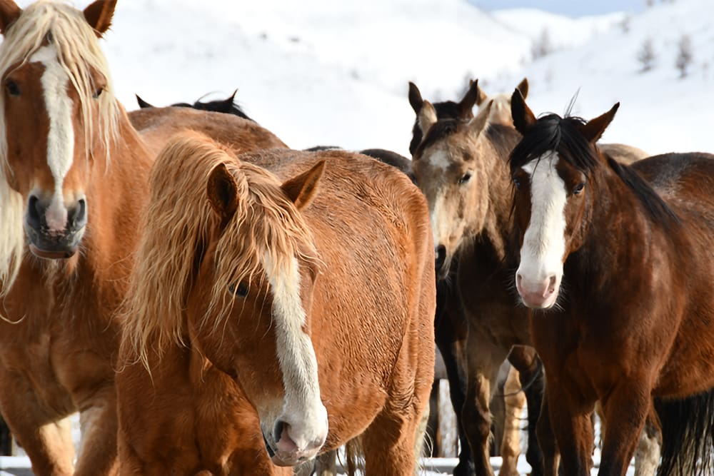 The entire herd is kept on a huge mountain meadow at night, and they come into the corrals at the ranch headquarters each morning, where the horses are caught and saddled for trail riding. At the end of the day, the herd runs back out to pasture to graze, socialize, and rest. Out in the meadow, they split up into smaller factions for the night before they gather up again in the morning to head back to the corrals.
