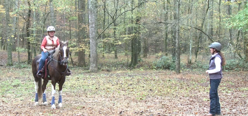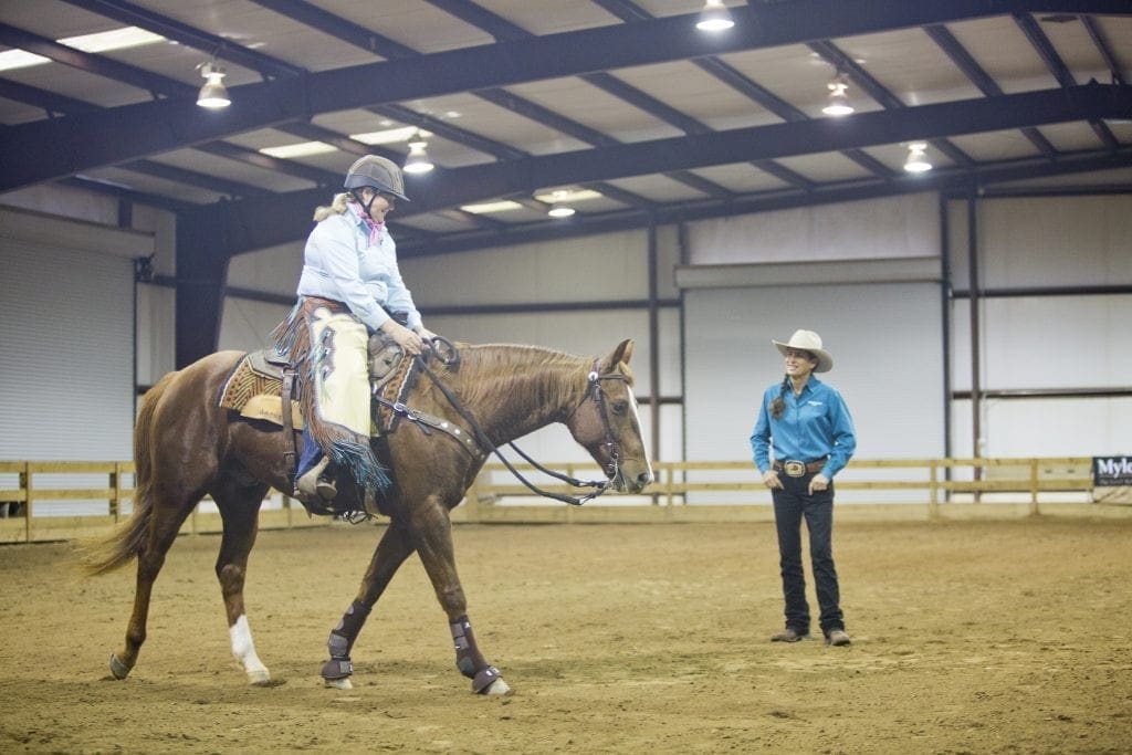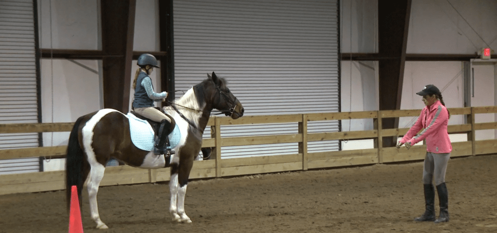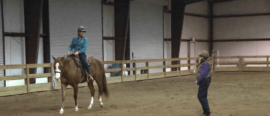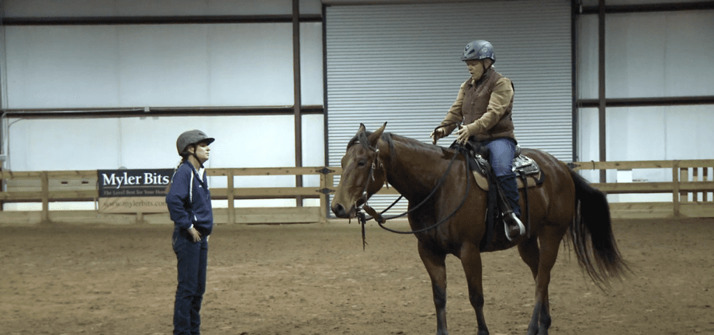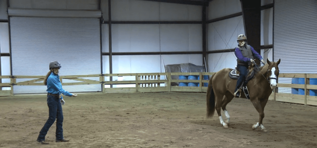 Julie talks with Joanne about how she should use rein to control Roscoe’s speed.