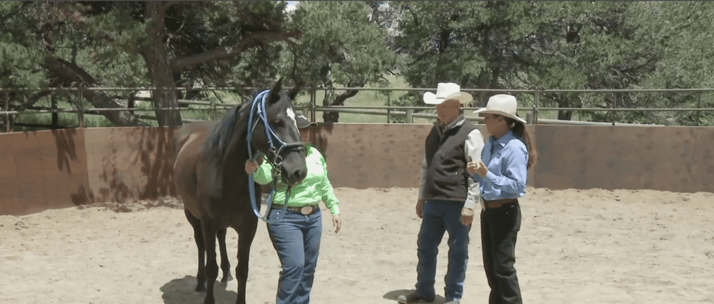 Julie Goodnight and Veterinarian Deb Schlutz work with a horse whose pain was keeping him from performing.