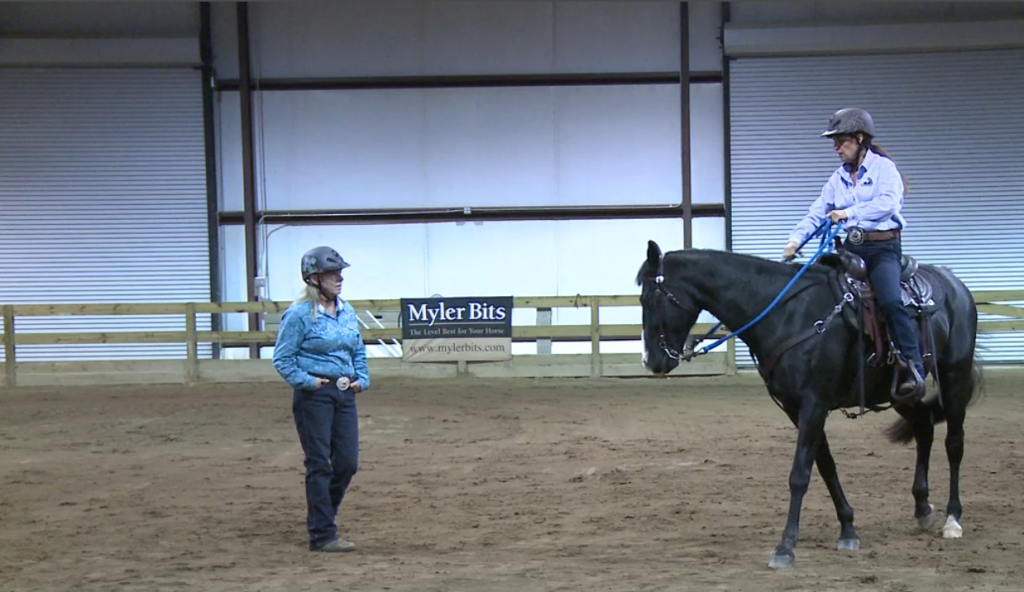 Julie Goodnight and Dale Myler help a rescued, off-the-track Thoroughbred learn new rein and bit cues so he can be adopted as a pleasure mount.
