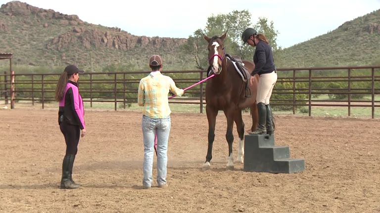 Julie Goodnight helps a champion show horse learn to stand still at the mounting block. Bonus footage not seen on TV.