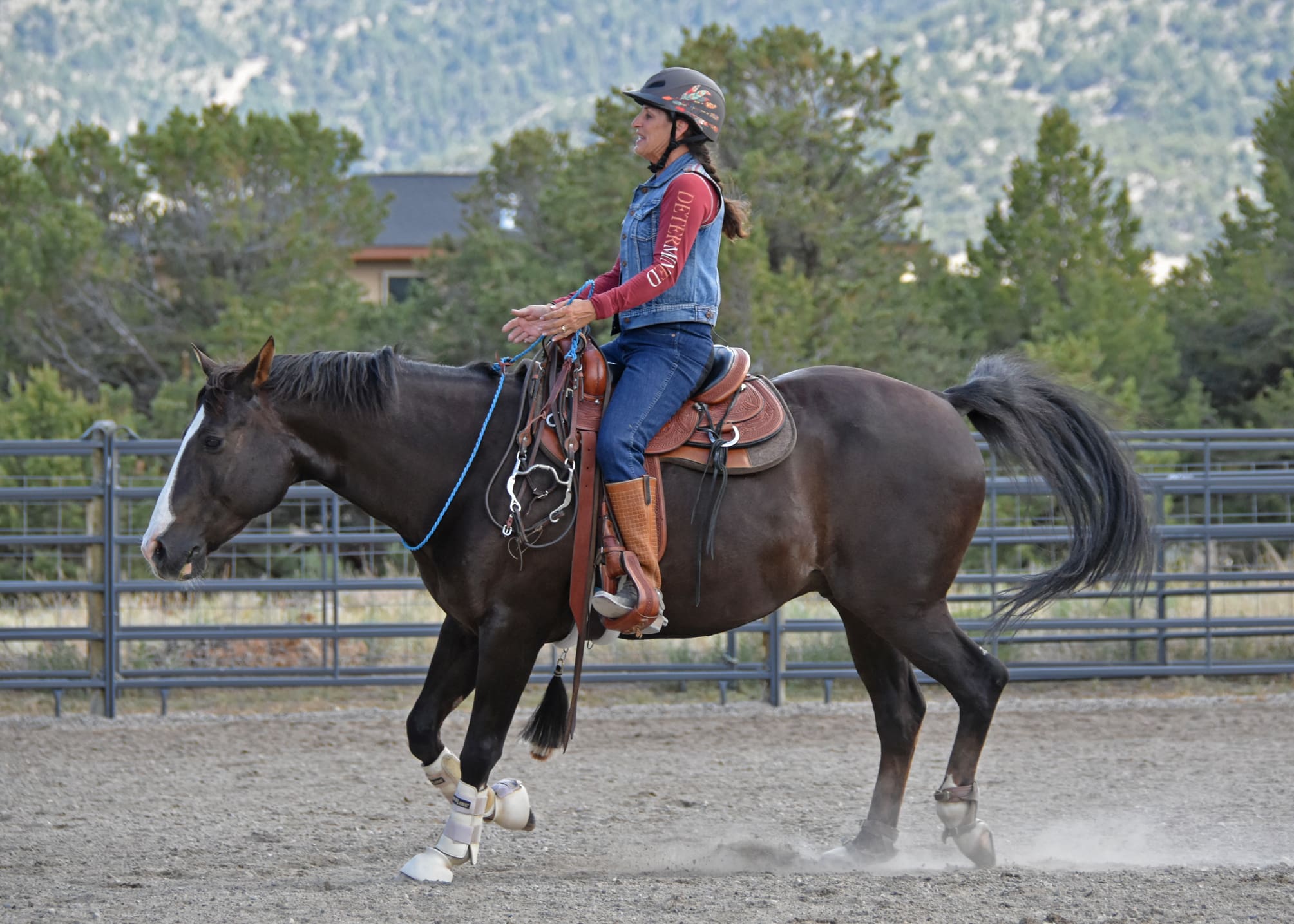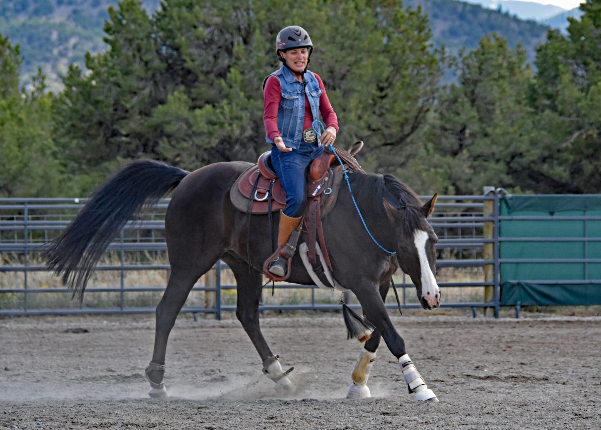 Julie teaching clinic at Oskie Rice Event Center, Maui Summer has finally arrived here in the Rocky Mountains. It’s the favorite time of year for our horses, when they finally